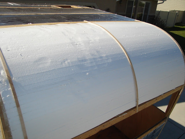 Temporary wood strips hold insulation in place while glue dries.